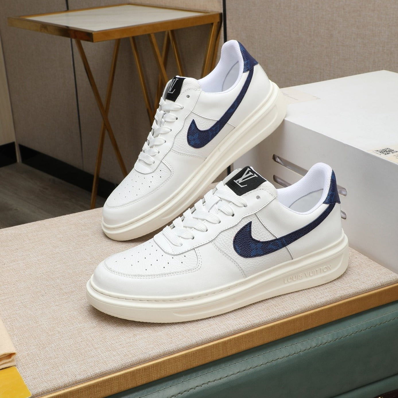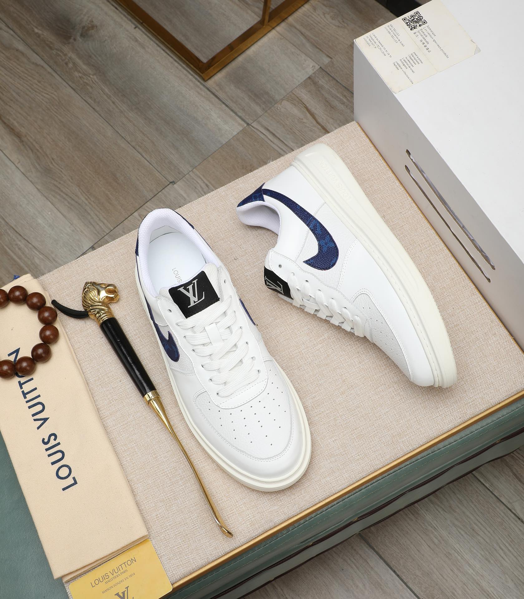 LV AIR FORCE 1 GLOSSY WHITE CALFSKIN WITH BLUE MONOGRAM LOGO