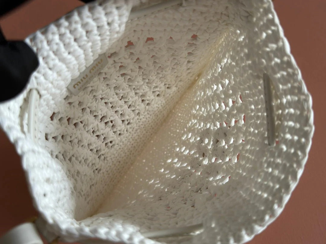 WANDER BUCKET BAG 23 WHITE IN RAFFIA WITH LEATHER TRIM