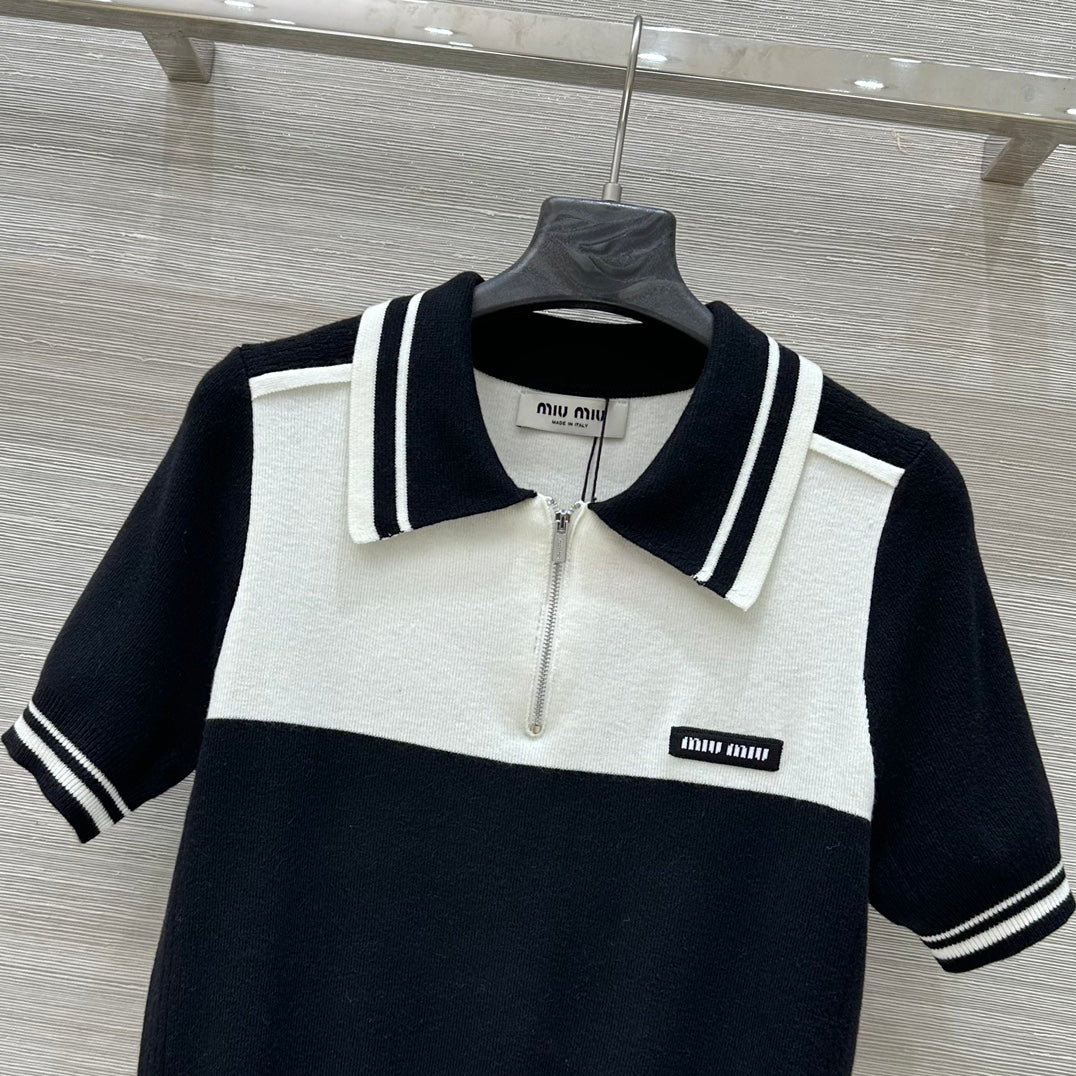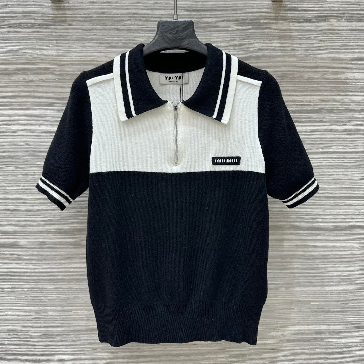 Miu Miu 25 Polo Collar Short-sleeved Top Black White Tencel