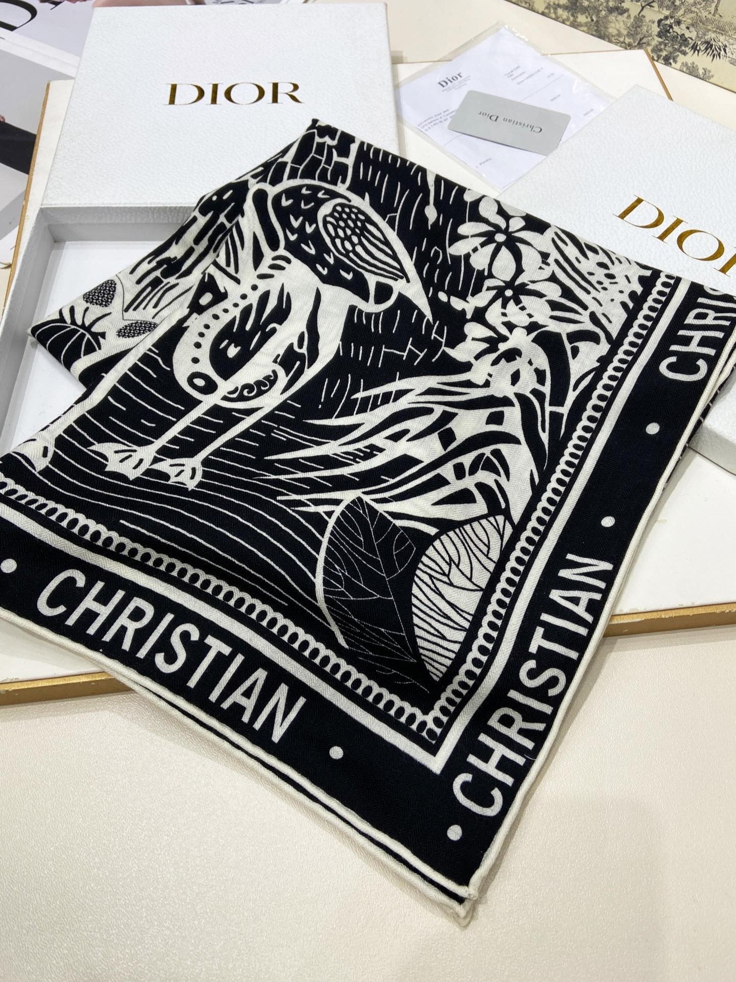 SQUARE SCARF 140 CM IN BLACK MIX WHITE MONOGRAM WOOL AND SILK 415109